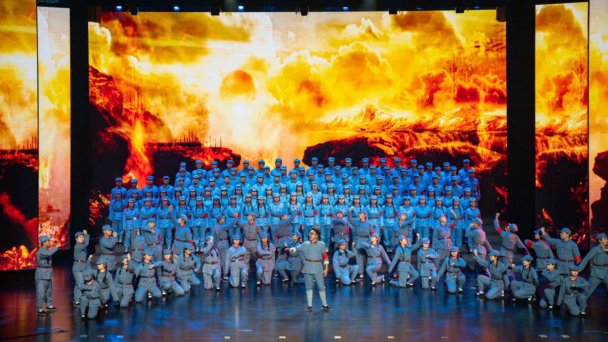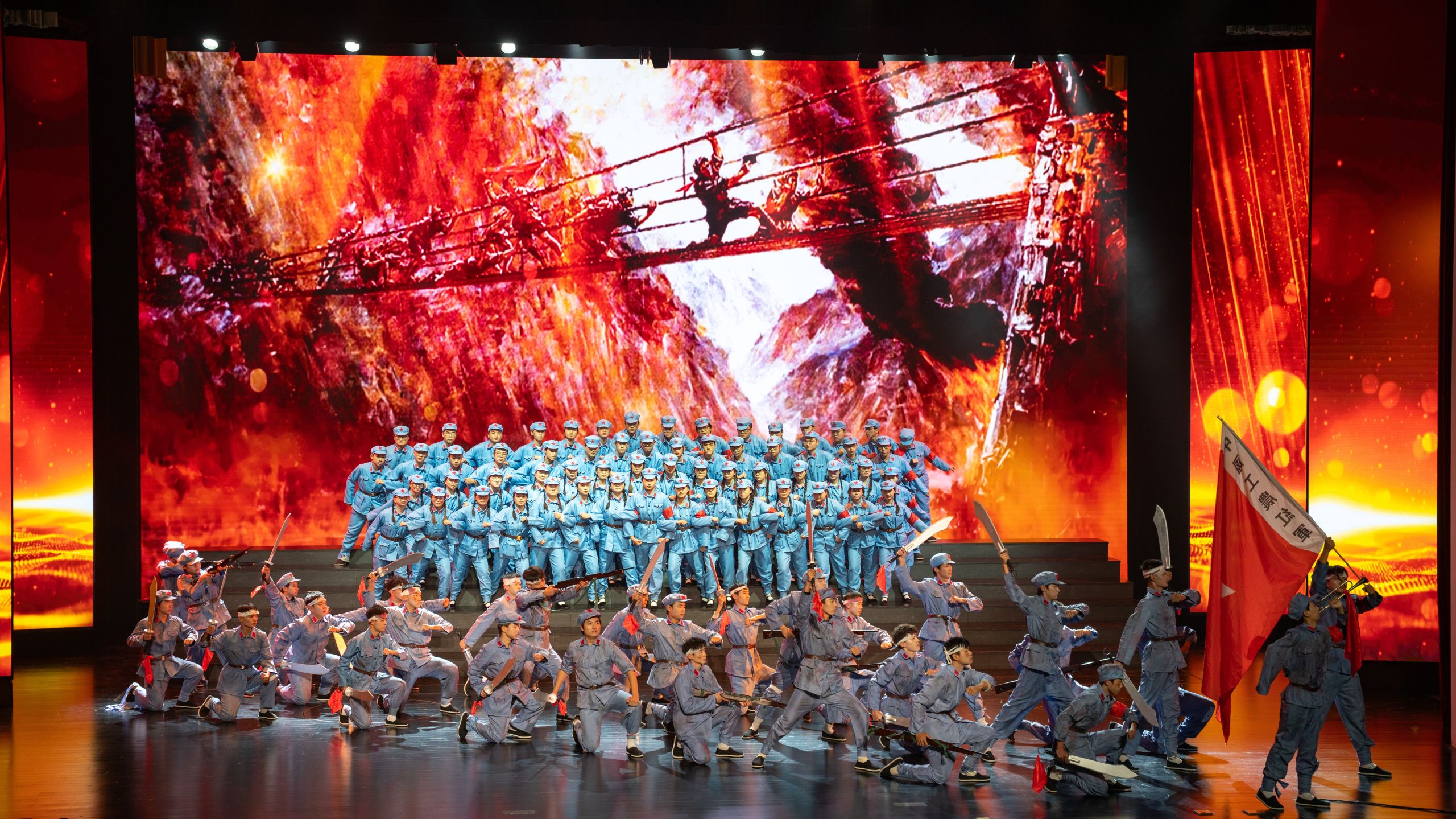 “红旗飘,军号响,子弟兵,别故乡……”随着《告别》的悠扬旋律,演出正式拉开帷幕。舞台上,演员们以真挚演绎生动勾勒出红军将士告别苏区、踏上远征的壮阔图景,再现了于都河畔军民鱼水情深、依依不舍的动人场景。《突破封锁线》的激昂前奏将观众拉回1934年那个秋天,每一个坚毅的步伐、每一次奋力的冲锋,都复刻着那段浴血奋战的壮烈征程。《遵义会议放光辉》的旋律响起,苗族乡亲与红军战士手拉手围成圈,芦笙的悠扬伴着红旗的招展,每一声歌唱都唱响了希望。《四渡赤水出奇兵》节奏灵动激昂,“毛主席用兵真如神”的合唱声震彻全场。《飞越大渡河》的旋律破空而来,强渡大渡河的浴血拼搏、飞夺泸定桥的生死冲锋,一幕幕惊心动魄的场景如在眼前。当《过雪山草地》的歌声缓缓流淌,灯光转为清冷,演员们用细腻表演诠释了极端恶劣环境中红军“革命理想高于天”的信念与团结互助的崇高品格。《大会师》的激昂旋律奏响,饰演红一、二、四方面军的演员们手持鲜艳的红旗,从舞台四周走向中央,环绕剧场齐声高唱。嘹亮的歌声中,三大主力胜利会师的历史性时刻在舞台上重现,红旗挥舞如燎原星火,台下掌声雷动,经久不息。