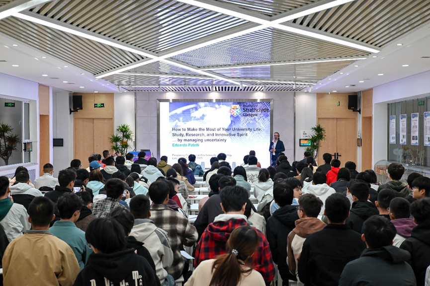 10月12日上午,英国知名教授、思克莱德大学Edoardo Patelli团队为我校导向班新生带来了题为“如何充实大学生活:学习、科研与创新精神——以驾驭未知提升工程安全与稳健前行”的科研启蒙报告。报告会由学校党委常委、副校长韩建平主持。